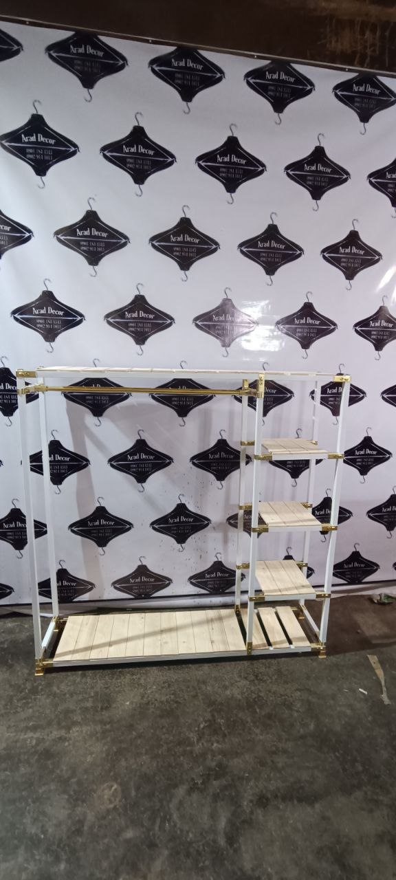 طراحی این مدل بهصورت بغل طبقهای انجام شده تا علاوه بر آویز لباس، بتوانید کیف، کفش، جعبه یا وسایل تزئینی را هم روی طبقات قرار دهید. ساخت تمام قطعات در کارگاه انجام میشود و مونتاژ بدون نیاز به جوشکاری یا ابزار خاص است.